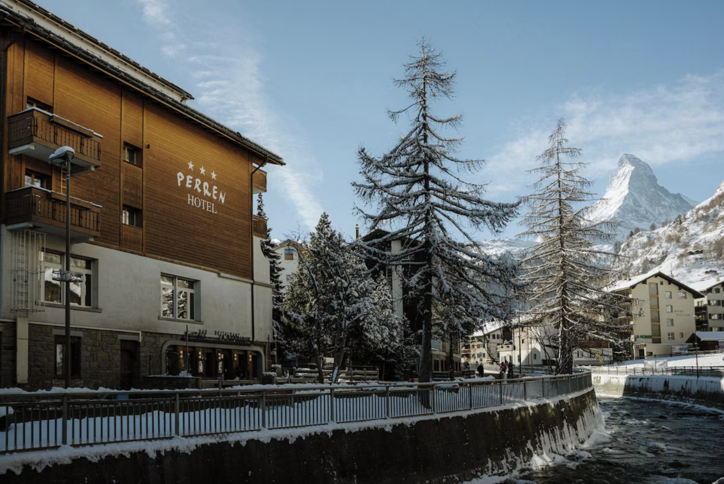 You arrive at Zermatt by train. It is a car-free village, but a short walk to get to you to base - Hotel Perren.